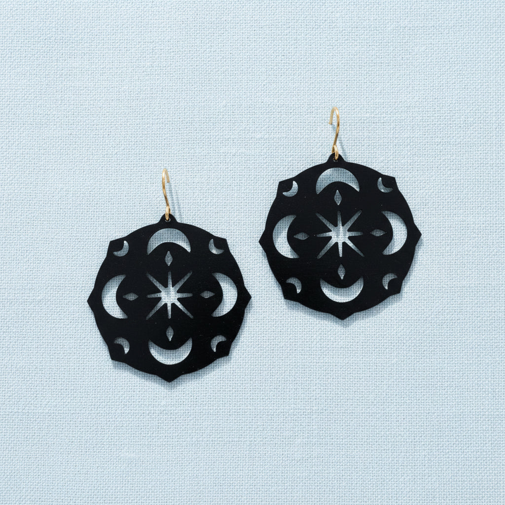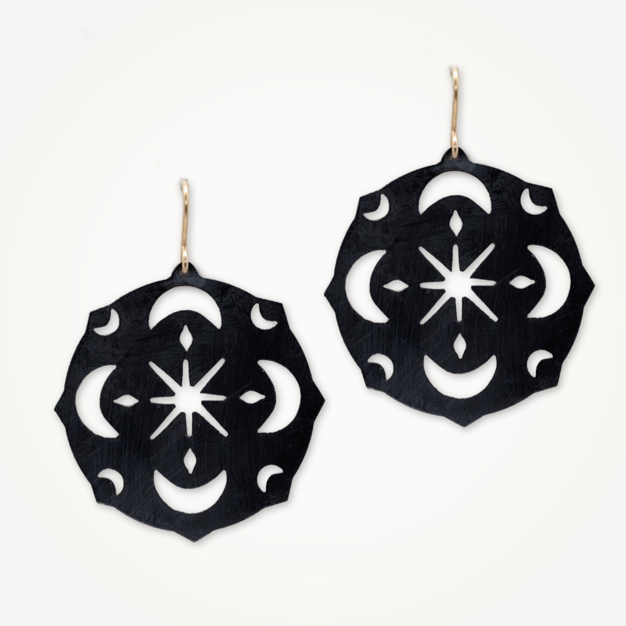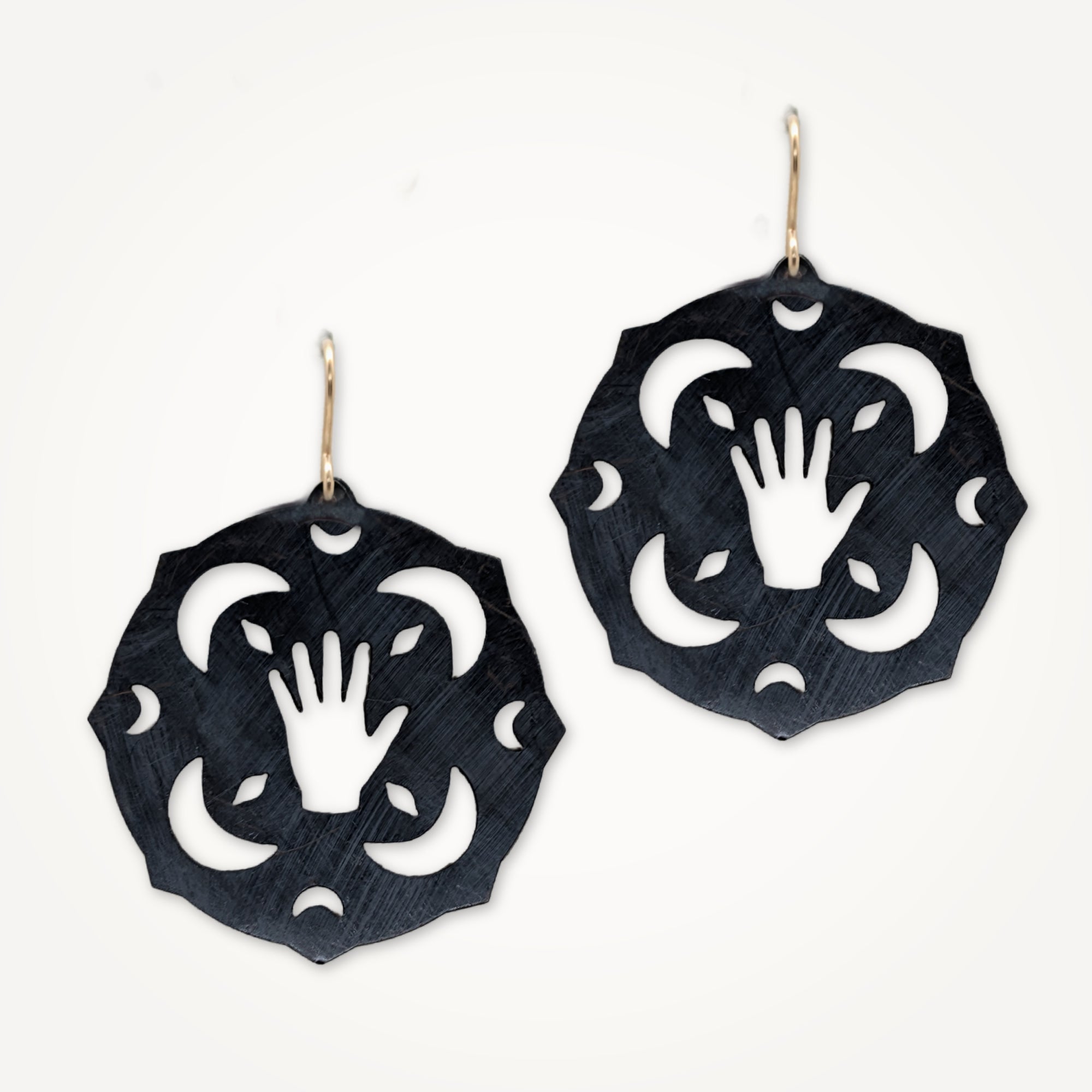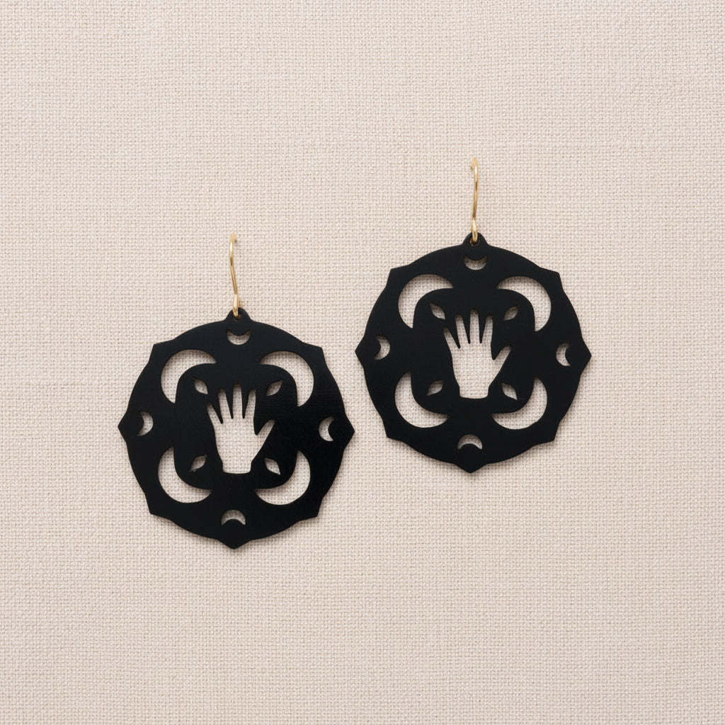 A collection of original sketches transformed into pierced and etched metal. Symbols drawn from nature and imagination become wearable talismans, each piece holding its own story.