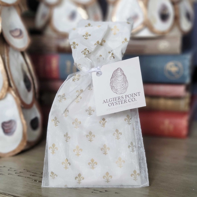 Your purchase will be wrapped in our signature fleur de lis tissue and tucked inside a white organza pouch or wrapped with brown paper and strings (depending on the size). Additionally, we will include a gift card with a personalized message if you indicate so at checkout.