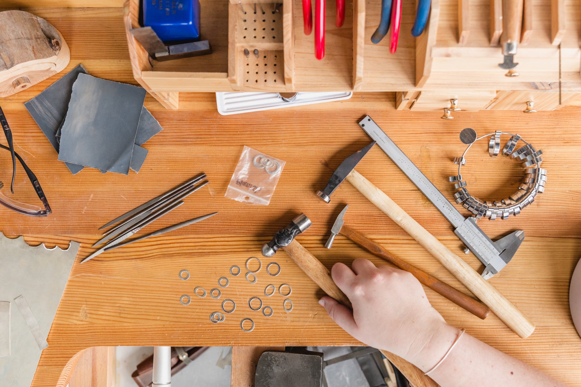 Our artisan hoops are individually created by hand. Each individual hoop is formed, soldered (with a torch), filed, hammered and polished in our New Orleans jewelry studio. Time, care + lots of love are put into each individual hoop.