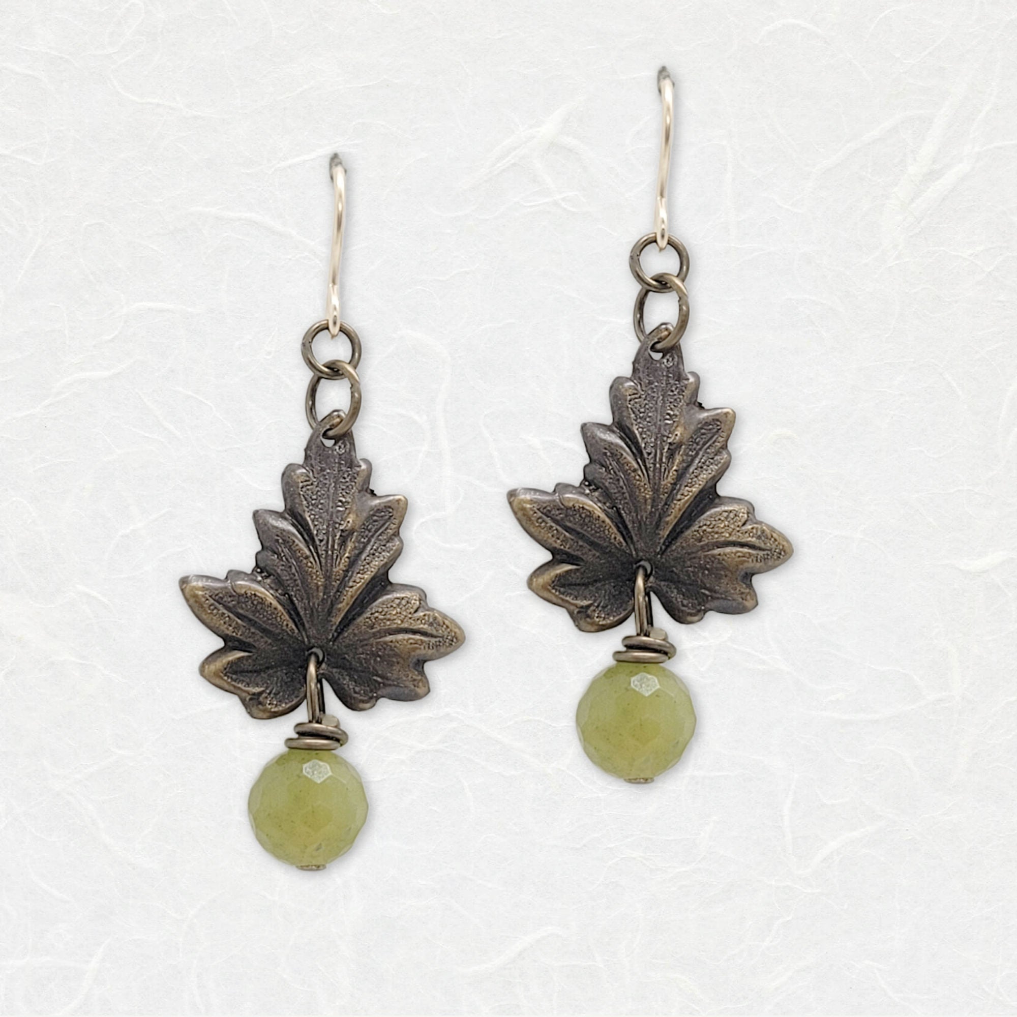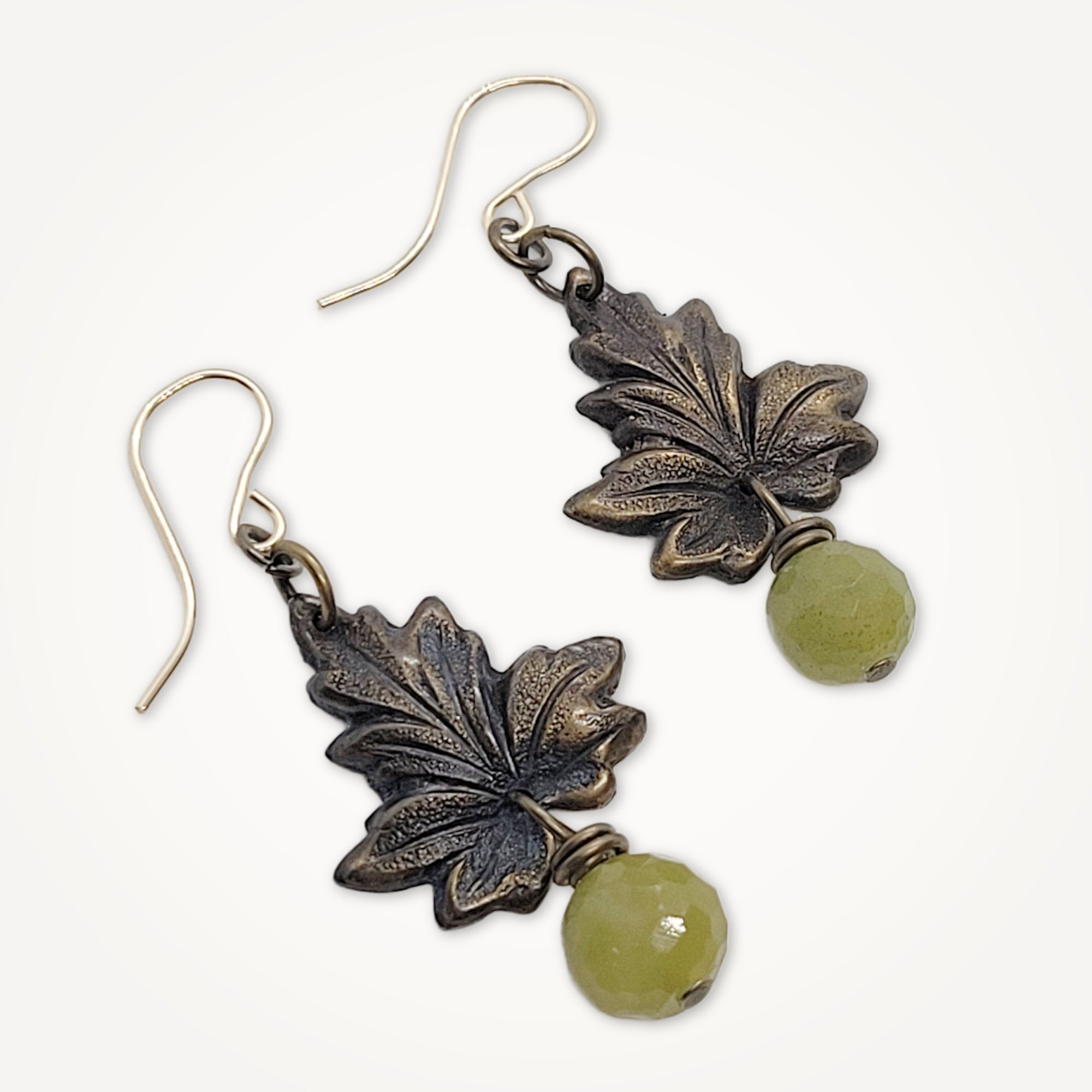 Our Grapevine Jade earrings feature antique brass grape leaves, beautifully detailed to capture the essence of nature's artistry. Each leaf is gracefully complemented by a wire-wrapped olive jade gemstone, faceted to catch the light with a subtle, elegant shimmer.